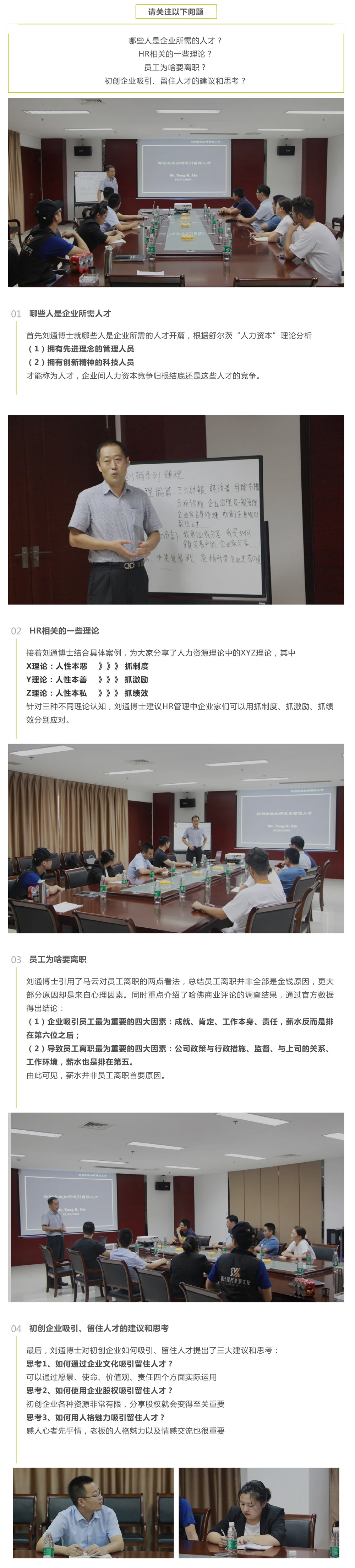 人才对于初创企业的重要性众所周知,它是决定成败的最重要因素之一。通过今天的课程很多企业家们心中都有了自己的思路与做法。大家表示受益匪浅,感谢刘通博士为初创业的企业家们提供了一场生动而有意义的课程。