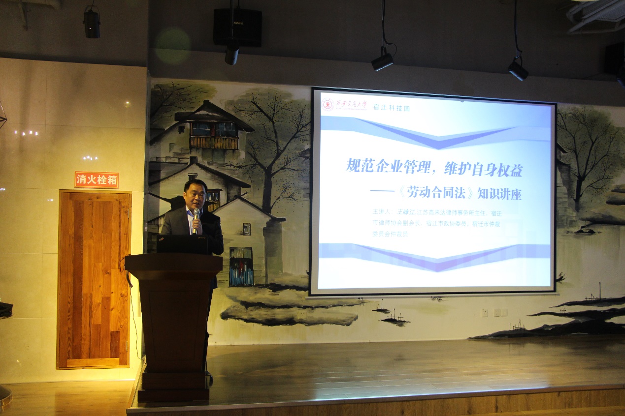为了进一步规范企业管理,维护自身权益,2018年5月4日下午,西交大宿迁科技园特邀江苏高来达律师事务所主任、宿迁市律师协会副会长、宿迁市政协委员、宿迁市仲裁委员会仲裁员王咏江律师来我园“西楚创客”众创空间开展《劳动合同法》知识讲座,来自经开区以及西交大宿迁科技园的十多家企业出席此次活动。
